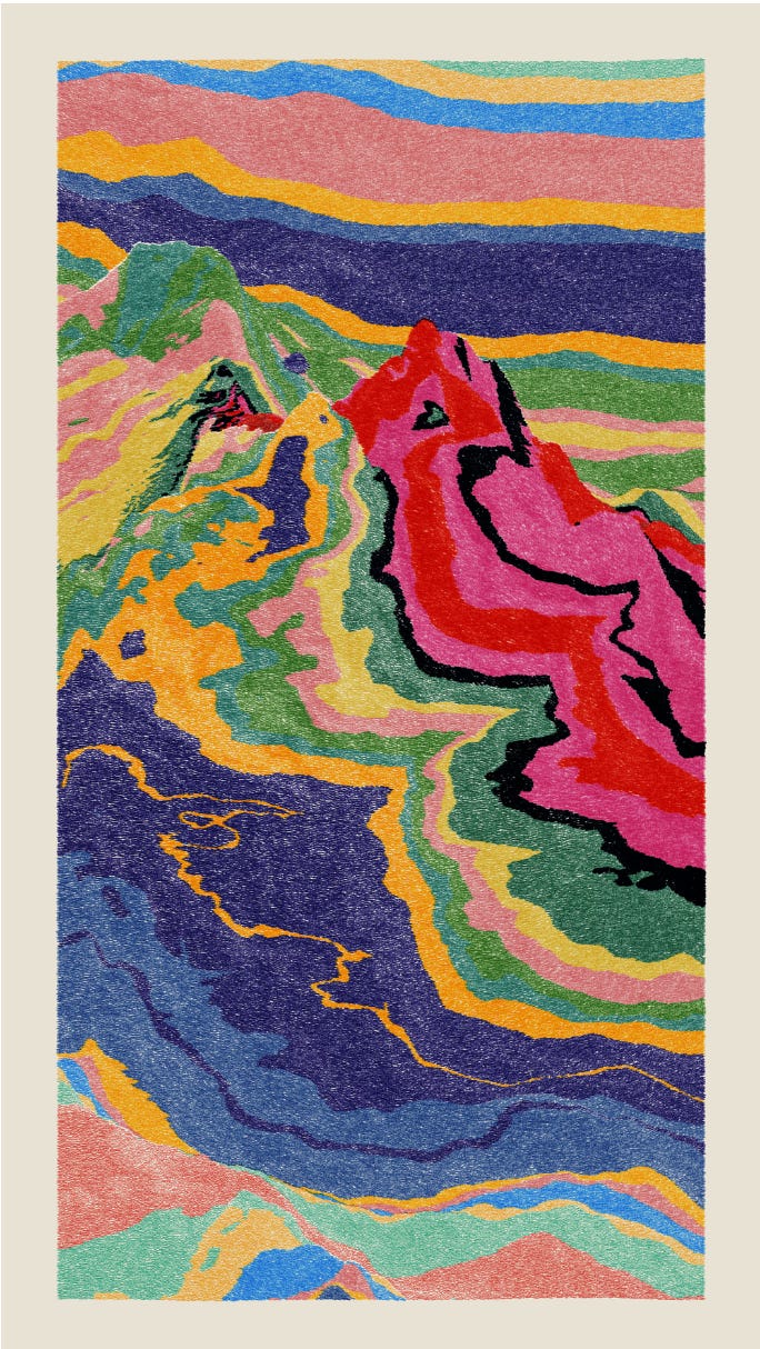 The software constructs stratified landforms using hundreds of thousands of small strokes of colour. The hash of each token describes a coordinate within a multidimensional generative space, locating a unique composition that lies along one of many possible longitudes.